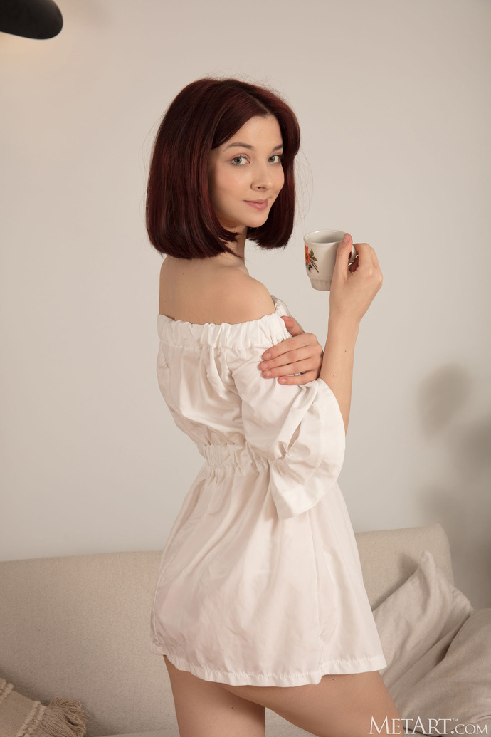 Hannah Everly makes a captivating debut in this soft, natural-light indoor set from MetArt, reclining nude on a cozy beige couch surrounded by lush green plants. The fresh-faced brunette with shoulder-length bob hair, expressive blue eyes, and subtle smile exudes effortless sensuality as she poses fully bare—small perky breasts with puffy nipples, flat toned stomach, and smooth shaved pussy on full display. She stretches languidly, legs spread wide in relaxed splits, arms draped overhead or hugging a pillow, offering intimate close-ups of her inviting folds and perfect curves. From overhead angles, her long legs frame her body beautifully, soles visible, pussy lips parted gently in explicit detail while she gazes directly at the camera with quiet confidence. She teases with slow movements—rolling onto her side to accentuate her round ass, kneeling to arch her back, or standing tall with one leg lifted on the couch arm, fingers lightly tracing her skin. Artistic, unhurried eroticism: youthful innocence meets subtle seduction in a warm, plant-filled living room